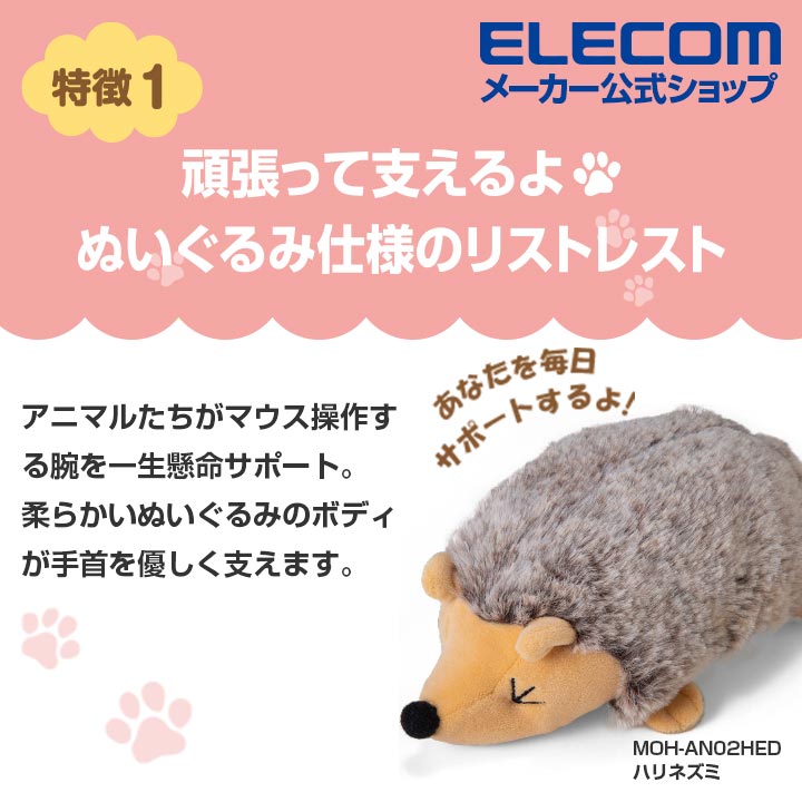 ■サイズ:幅200mm×奥行110mm×高さ70mm■材質:表面/わた:ポリエステル■カラー:イヌ■その他:本体重量:34.3gエレコムダイレクトショップ頑張って支えるよ!アニマルたちがマウス操作する腕を一生懸命サポート。